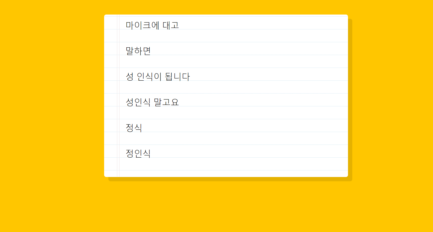 마지막으로, recognition의 end 이벤트에 반응해 recognition을 다시 시작해 주면, 말하기를 중단한 뒤에 다시 말해도 음성을 인식한다. 이 코드가 없으면 한 번 음성 인식이 중단된 후에는 음성을 인식하지 않는다.