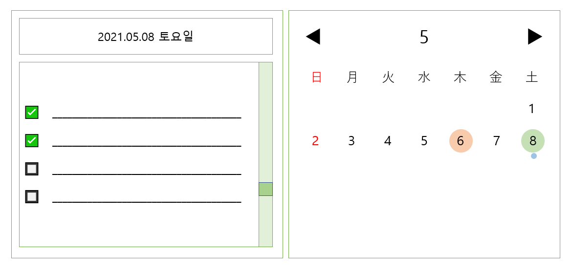 위와 같은 형태로, 오른쪽에 달력을 만들고, 현재 날짜를 표시하며 왼쪽에는 현재 날짜의 to-do list를 만든다.