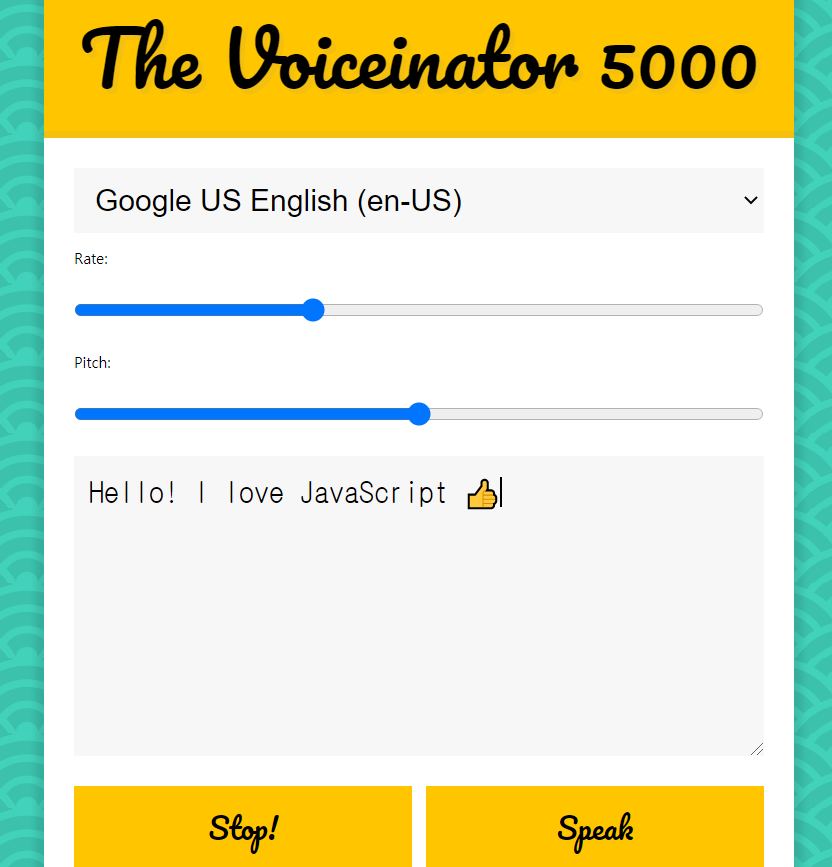 toggle 함수는 speakButton과 stopButton이 클릭되었을 때 실행되도록 한다. toggle 함수는 기본적으로 speechSynthesis의 매소드인 cancel을 통해 진행중인 음성 읽기 서비스를 중단시킨다. 여기에 true로 설정한 startOver가 전달되는 경우에는 speak 매소드로 speechSynthesis를 다시 실행시킨다. toggle에 false가 전달되면 if문은 실행되지 않고 서비스가 중단되기만 할 것이다.