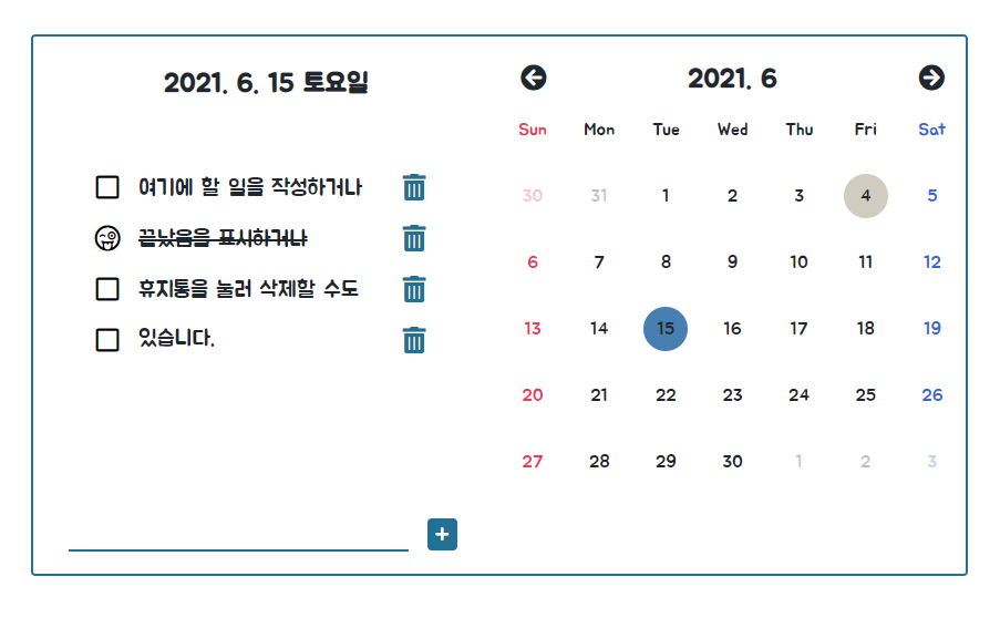 CSS에서, 토요일과 일요일을 각각 파란색, 빨간색으로 표시하기 위해, n번째 자식 요소에 스타일을 적용하는 nth-child를 이용해 색깔을 바꿔 줌으로써 달력의 형태가 얼추 갖춰진다.