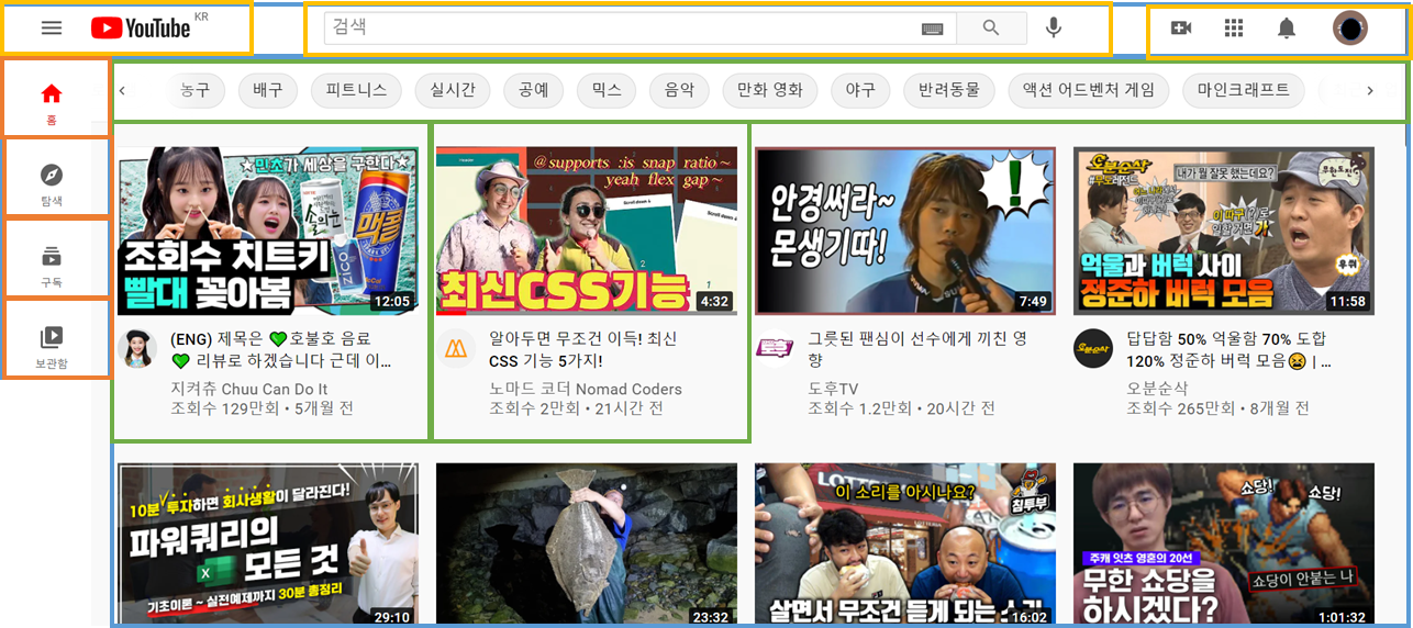 파란 박스 안의 상단부가 FilterBar, 비디오들이 담긴 박스가 VideoBox이다.